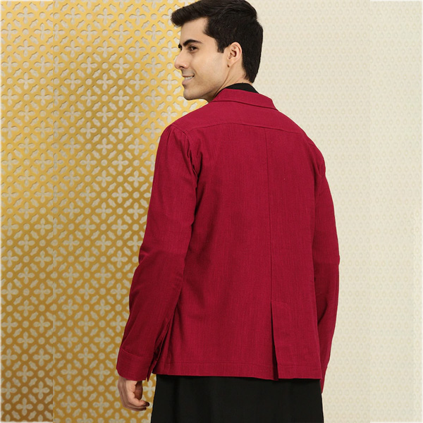This line draws upon traditional costumes for inspiration while rendering an modern aesthetic. Rich textiles with minimal yet exquisite zari embroideries. Ideal for celebrating the evening with a contemporary take on festive attire. Product Design: Red solid single-breasted blazer Has a notched lapel Long sleeves Button closure
